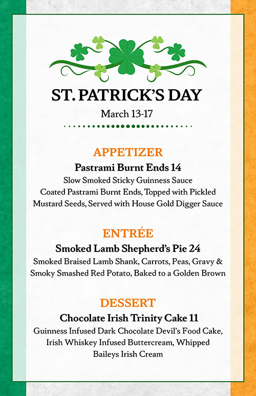 Come raise a glass (or Guinness) at MOTOR and enjoy a special St. Patrick’s Day menu March 13-17.